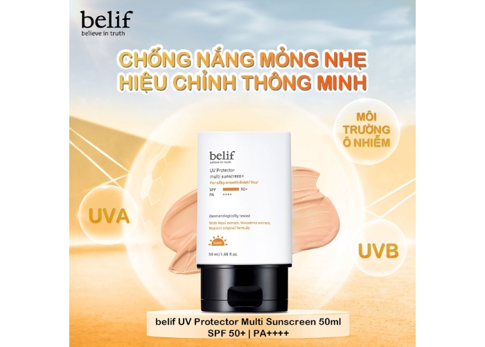 Belif UV Protector Multi Sunscreen SPF50+ PA++++ 50ml chính là giải pháp chống nắng được săn đón. Đây không chỉ là một lớp bảo vệ tối ưu mà còn là một loại kem chống nắng hiệu chỉnh da (tone-up) tinh tế, giúp da sáng mịn tự nhiên mà không cần đến lớp nền dày.