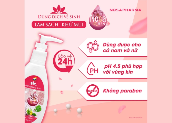 Nosa Queen là dung dịch vệ sinh phụ nữ từ thương hiệu Nosa, Việt Nam, chuyên sản phẩm chăm sóc vùng kín dịu nhẹ từ thiên nhiên. Sản phẩm dạng gel tạo bọt nhẹ, chai 150–210ml, phù hợp sử dụng hàng ngày. Công thức tập trung vào làm sạch sâu, giảm viêm ngứa và duy trì pH sinh lý, không phải thuốc trị bệnh phụ khoa.
