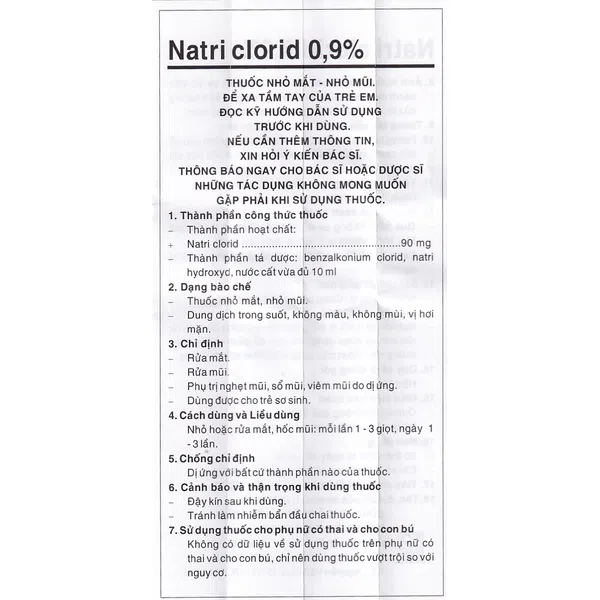 - Thuốc nhỏ mắt - nhỏ mũi Natri Clorid 0,9% lọ 10ml của công ty Cổ phần Dược phẩm Pharmedic, thành phần chính Natri Clorid, là thuốc dùng để rửa mắt, rửa mũi, phụ trị nghẹt mũi, sổ mũi, viêm mũi do dị ứng.