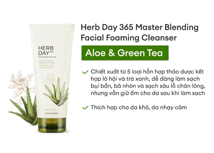 Thương hiệu mỹ phẩm Hàn Quốc The Face Shop đã mang đến giải pháp tối ưu cho vấn đề này thông qua sản phẩm Sữa Rửa Mặt Tạo Bọt Dành Cho Da Khô Herb Day 365 Master Blending Facial Foaming Cleanser Aloe & Green Tea 100ml. Với công thức kết hợp Nha Đam và Trà Xanh, sản phẩm này hứa hẹn làm sạch dịu nhẹ và cấp ẩm hiệu quả. Liệu phiên bản sữa rửa mặt tạo bọt Herb Day này có thực sự phù hợp với da khô? Hãy cùng Newwaymart khám phá Herb Day 365 giá bao nhiêu và cách để mua Herb Day 365 chính hãng ở đâu.