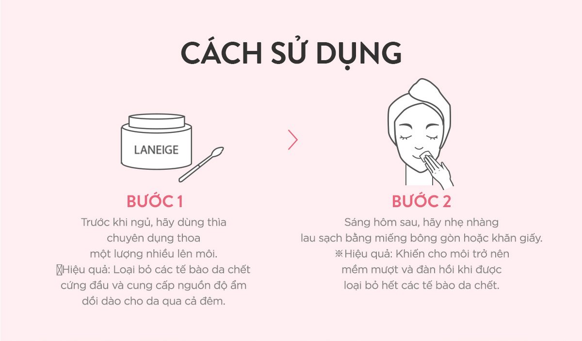 ※ Hiệu quả: Khiến cho môi trở nên mềm mượt và đàn hồi khi được loại bỏ hết các tế bào da chết.