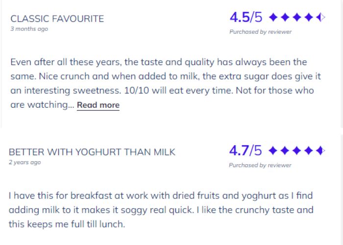 Một số người dùng đánh giá cao các sản phẩm ngũ cốc của Kellogg's vì chúng tiện lợi và cung cấp một lượng dinh dưỡng tốt cho cơ thể. Các sản phẩm ngũ cốc của Kellogg's cũng được đánh giá cao về hương vị và độ giòn. Đặc biệt là trong các sản phẩm Frosted Flakes và Froot Loops.