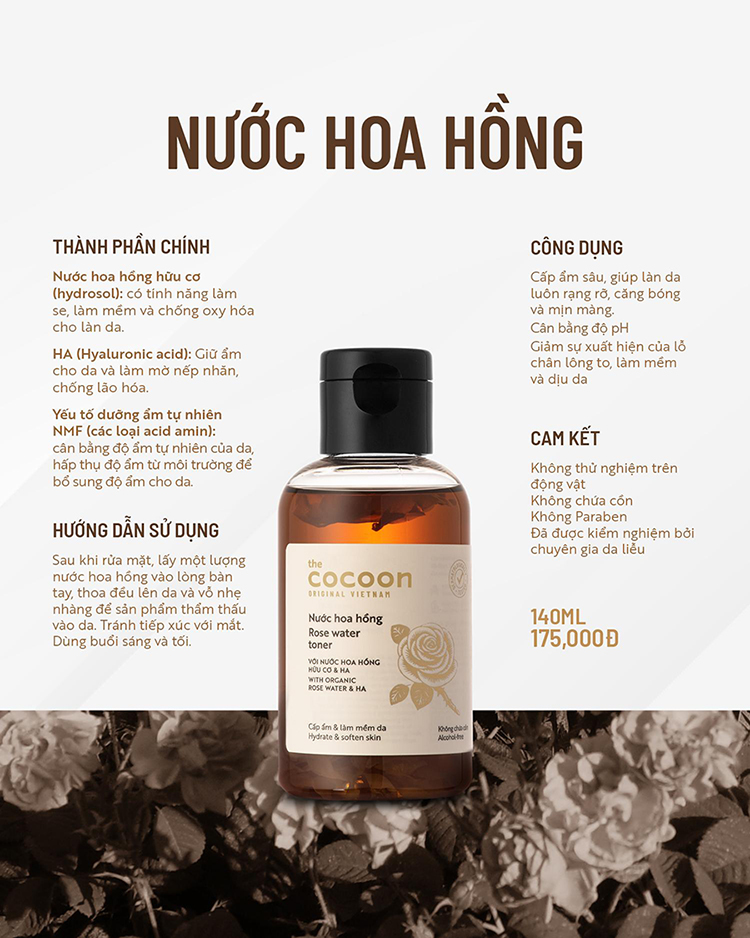 Nước hoa hồng Cocoon giúp cấp ẩm, làm mềm, giảm sự xuất hiện của lỗ chân lông to, mang lại làn da tươi mới.