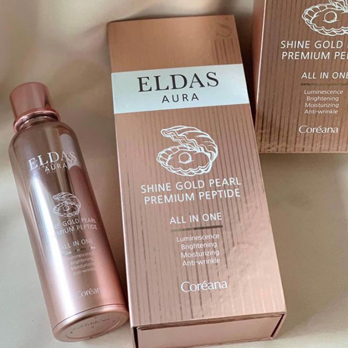 Tinh chất tế bào gốc Eldas Aura Coreana Shine Gold Pearl Premium Peptide All In One 100ml có xuất xứ từ Hàn Quốc bởi hãng mỹ phẩm nổi tiếng Coréana ra đời từ năm 1988. Với 27 năm kinh nghiệm xây dựng và nghiên cứu phát triển những dòng mỹ phẩm hoàn toàn từ thiên nhiên dành chăm sóc và làm đẹp cho làn da phụ nữ châu Á, Coréana đã tạo nên uy tín vô cùng lớn và được rất nhiều khách hàng trên thế giới tin dùng như: Mỹ, Trung Quốc, Singapore… và có cả Việt Nam. Serum Tế Bào Gốc Eldas Aura là “phép màu” đột phá siêu vượt trội hoàn hảo dành riêng cho phái đẹp duy trì làn da không tuổi và “sức ép của thời gian”. Serum Tế Bào Gốc Eldas Aura Coreana Shine Gold Pearl Premium Peptide All In One là phiên bản nâng cấp của Serum Eldas truyền thống với sự góp mặt của tinh chất vàng 24K kết hợp cùng nhiều dưỡng chất khác mang đến cho bạn một làn da đẹp hoàn hảo không tì vết.