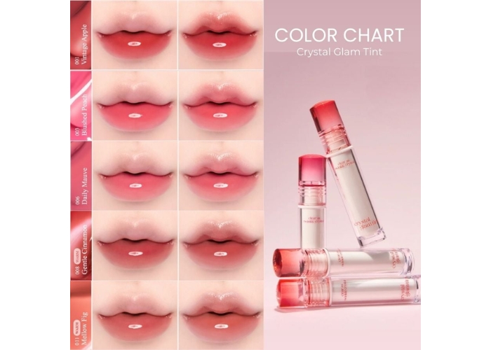 Bảng màu của Crystal Glam Tint được thiết kế với các tông màu thiên về đỏ, cam và nude, phù hợp với tông da châu Á. Một số màu nổi bật bao gồm:
