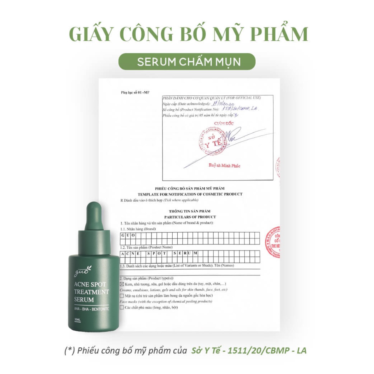 Acne Spot Treatment Serum – Serum chấm mụn GUO là sự kết hợp giữa AHA, BHA có tác dụng hỗ trợ điều trị mụn, giảm sưng đau, se cồi mụn nhanh chóng. Ngoài ra sản phẩm giúp làm dịu mẩn đỏ, chống dị ứng, kích ứng, dịu nhẹ cho da nhạy cảm.