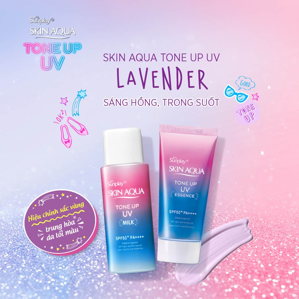 Sunplay Skin Aqua Tone Up UV Milk Lavender dành cho da vàng, tối màu, với chất kem màu tím độc đáo, được kết hợp từ sắc hồng và xanh dương, giúp hiệu chỉnh và nâng tone da trở nên sáng hồng trong suốt, đồng thời dưỡng ẩm và kiềm dầu cực đỉnh.