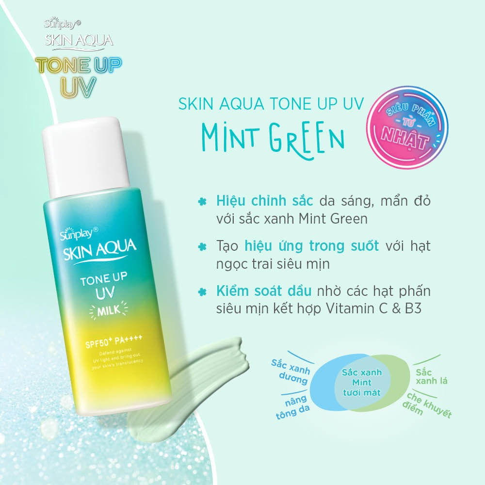 Sunplay Skin Aqua Tone Up UV Milk Mint Green dành cho da nhạy cảm, mẩn đỏ, da mụn, với chất kem hoà quyện giữa sắc xanh dương và xanh lá, tạo nên tông xanh mint trung hoà, cực kì hiệu quả trong việc hiệu chỉnh sắc da nhạy cảm, cho nàng làn da trong veo tinh khiết, giúp nâng tông và che các nốt mụn đỏ.