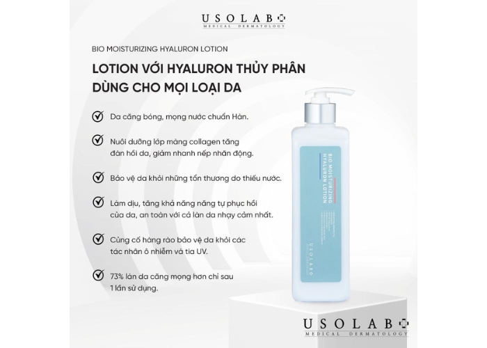 Sản phẩm nổi bật trong dòng dưỡng ẩm của hãng là Usolab Bio Moisturizing Hyaluron Lotion 500ml. Đây không chỉ là một sản phẩm lotion cấp nước thông thường mà còn gây ấn tượng mạnh mẽ bởi dung tích lớn 500ml, mang lại giá trị kinh tế cao cho người dùng. Sản phẩm này được định vị là giải pháp hoàn hảo cho những làn da đang cần chăm sóc da khô, da nhạy cảm, và đặc biệt là da bị mất nước nghiêm trọng.